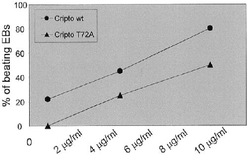 Figure 9. Modulation of Cripto activity by O-fucosylation. Dose-dependent activity of T72A mutant Cripto compared with wt Cripto as assayed in cardiomyocyte differentiation assay. 2-d-old Cripto−/− EBs were treated with increasing amounts of either recombinant soluble T72A mutant or wt Cripto protein for 24 h and then cultured for the remaining days. Appearance of beating areas was scored from day 8 to 12 of the in vitro differentiation. Data are representative of two independent experiments.