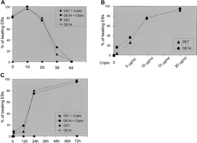 Figure 4. Dynamics of Cripto signaling in cardiomyocyte differentiation. (A) Definition of the temporal activity of Cripto. Percentage of Cripto−/− EBs containing beating areas after addition of recombinant Cripto protein. 10 μg/ml of soluble Cripto protein was added to EBs at 24-h intervals starting from time 0 of the in vitro differentiation assay (scheme in Fig. 1). The number of EBs containing beating areas was scored from day 8 to 12 of in vitro differentiation. (B) Dose-dependent activity of Cripto protein. 2-d-old Cripto−/− EBs were treated with increasing amounts of recombinant soluble Cripto protein for 24 h and then cultured for the remaining days. Appearance of beating areas was scored from day 8 to 12 of the in vitro differentiation. (C) Duration of Cripto signaling. 2-d-old Cripto−/− EBs were treated with 10 μg/ml of recombinant soluble Cripto protein for different lengths of time, 1, 12, 24, and 72 h. EBs were then washed to remove the protein and cultured for the remaining days. Cells were examined for cardiac differentiation as described above. In all cases, two independent Cripto−/− ES clones (DE7 and DE14) were used. Data are representative of at least two independent experiments.