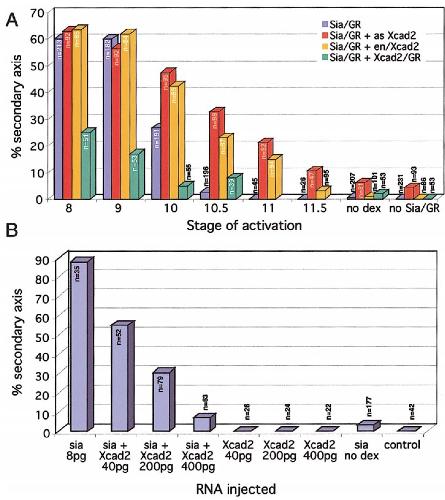 amount of sia/GR RNA (8 pg) alone or with increasing amounts of Xcad2/GR mRNA (40, 200, and 400 pg). The fraction of secondary axes