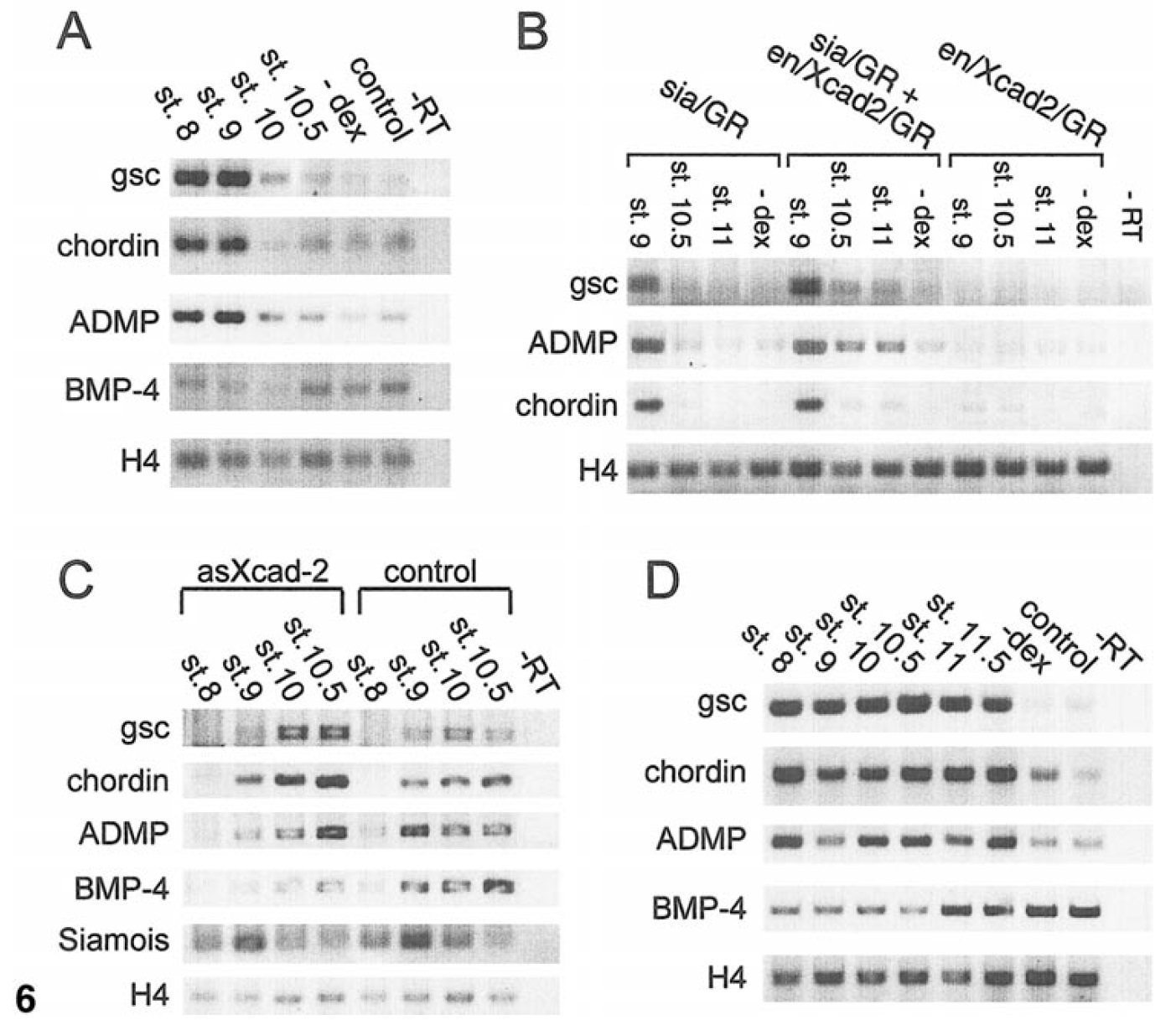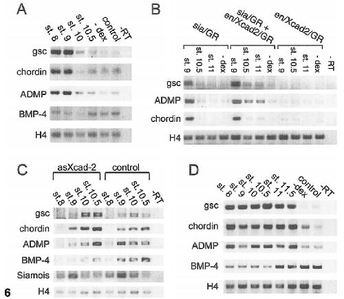 sia/GR and treated with dex between stages 8 and 10.5. The genes tested were gsc, chordin, ADMP, BMP-4, and histone H4 as a loading control.