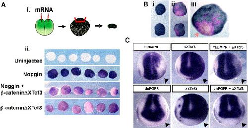 Fig. 8. Neural induction requires the interplay of BMP, FGF and Wnt signals. (A) (i) Schematic of an animal cap assay. (ii) In situ hybridization examining Sox3 expression in animal caps injected as indicated and cultured to Stage 15. Sox3 expression is induced by BMP attenuation (Noggin expressing caps) but not by β-cateninδXTcf3. β-CateninδXTcf3 inhibits Noggin-mediated Sox3 expression when coexpressed. (B) β-CateninδXTcf3 inhibits Sox3 expression cell autonomously. Embryos were injected with mRNA encoding Noggin in both cells at the two-cell stage (iii) and subsequently at the four-cell stage a single blastomere was injected with β-gal alone (i) or β-gal plus β-cateninδXTcf3 (ii, iii). Note that cells expressing lineage tracer and β-cateninδXTcf3 do not also express Sox3. (iii) Magnified view of upper explant pictured in ii. (C) Embryos were injected into one cell at the two-cell stage with the indicated mRNA (noted in boxes above the embryo) and β-gal RNA. Embryos were harvested at stage 15 and probed for Sox3. Blocking FGF signals with a dominant inhibitory FGF receptor (dnFGFR) partially rescues expansion of the neural plate seen with δXTcf3 alone. Upregulation of BMP signaling with a constitutively active type 1 BMP receptor (caBMPR) also rescues the δXTcf3-mediated expansion of the neural plate and also decreases expression of Sox3 within the normal neural plate forming region. These findings indicate that the ability of δXTcf3 to induce ectopic neural tissue is dependent on the status of BMP and FGF signals. Arrows indicate injected side.