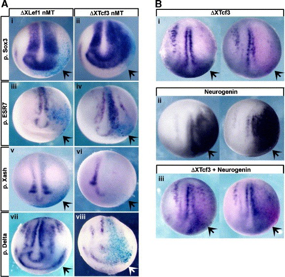 Fig. 5. δXTcf3 expands the neuronal precursor pool but inhibits neuronal differentiation. (A) mRNA encoding δXTcf3 or δXLef1 was coinjected with β-gal into one blastomere at the two-cell stage. Embryos were examined by in situ hybridization at stage 18 for expression of Sox3 (i, ii); ESR7 (iii, iv); Xash (v, vi); and Delta (vii, viii). All embryos are viewed dorsally with anterior down. Blue staining represents β-gal staining and arrows indicate injected side. δXTcf3 expands expression of Sox3 (ii), and ESR7 (iv), but inhibits markers of neuronal differentiation including Xash (vi) and Delta (viii). While δXLef1-injected embryos show a limited expansion of markers of neuronal precursors, there is no significant effect on markers of neuronal differentiation. (B) Embryos were injected with mRNA encoding β-gal and δXTcf3, Neurogenin, or both. Arrows indicate injected side. (i) δXTcf3 inhibits N-tubulin. Embryos injected with mRNA encoding Neurogenin induces ectopic neural differentiation marked by N-tubulin. (iii) δXTcf3 is able to block ectopic neural differentiation caused by Neurogenin.