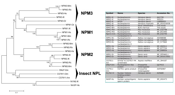 Figure 6. Phylogenetic tree of nucleophosmin/nucleoplasmin family members from various metazoans. Amino acid sequences were aligned with CLUSTAL W (Thompson et al., 1994), and the tree was produced with MEGA 3.1 (Kumar et al., 2004) using the neighbor-joining method. Two other histone-binding proteins, NASP [61] and N1/N2 [62], which are closely related to each other [61] but unrelated to the nucleophosmin/nucleoplasmin family were used to root the tree. Bootstrap significance values are shown at the corresponding internal nodes after 1000 replications.