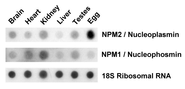 Figure 7. Northern dot blot hybridizations comparing Npm2 and Npm1 mRNA levels in different R. catesbeiana tissues. In the top two rows 7.5 μg of total RNA was loaded per well and the blot was probed with P32 labeled X. laevis Npm1 or R. catesbeiana Npm2 cDNA amplified from PCR. In the bottom row 1.5 μg of total RNA was loaded per well and the blot was probed with a P32 labeled 18S ribosome cDNA probe which was used as a loading control.