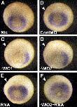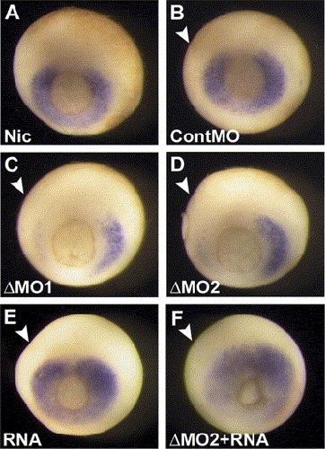 Fig. 5. Specificity of X-Delta-2 morpholinos. Two non-overlapping morpholinos were injected in the LHS of the embryos and the Hoxc6 expression analysed at gastrula stage. The Hoxc6 expression is shown for NIC (A), control MO (B: 100%, n=21), MO1 (C: 88%, n=26) and MO2 (D: 100%, n=35). Overexpression of X-Delta-2 mRNA (E: 100%, n=26) and rescue of X-Delta-2 MO2 with X-Delta-2 mRNA (F: 66% rescued, n=30) are also shown. Embryos are shown from the vegetal side with dorsal to the top. Both MOs knocked down Hoxc6 expression in the LHS and co-injection of X-Delta-2 mRNA is able to rescue the Hoxc6 expression. Arrowheads indicate the injected side of the embryo. |