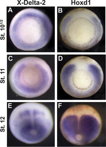 Fig. 3. X-Delta-2 and Hox genes are expressed in an overlapping domain during gastrulation. The expression patterns of X-Delta-2 (A,C,E) and Hoxd1 (B,D,F) were analysed by whole-mount in situ hybridisation. The expression of both genes at stage 101/2 (A,B), stage 11 (C,D) and stage 12 (E,F) shows an overlap in their domains of expression. Embryos at stage 101/2 (A,B) and 11 (C,D) are shown from the vegetal side with dorsal to the top, and those at stage 12 (E,F) from the dorsal side with anterior to the top. |