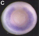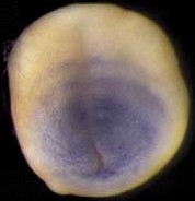 hes7.2 ( hairy and enhancer of split 7, gene 2) gene expression in Xenopus laevis embryos, NF stage 14, asassayed by in situ hybridization, posterior-dorsal view, anterior up. |