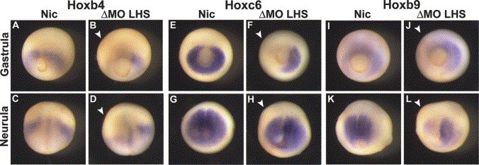 Fig. 4. X-Delta-2 is necessary for Hox gene expression during early development, prior to somite formation. X-Delta-2 morpholino (MO) was injected in the LHS of the embryo and the expression of Hoxb4 (A-D), Hoxc6 (E-H) and Hoxb9 (I-L) analysed by whole-mount in situ hybridisation at gastrula and neurula stages. Gastrula stage embryos (A,B,E,F,I,J) are shown form the vegetal side with dorsal to the top and neurula stage embryos (C,D,G,H,K,L) from the dorsal side with anterior to the top. At gastrula stage almost no expression of Hox genes was observed in the injected side (B: Hoxb4, 90%, n=21; F: Hoxc6, 94%, n=37; J: Hoxb9, 100%, n=30). At neurula stage Hoxb4 expression was shifted posteriorly (D: 79%, n=24), Hoxc6 expression was only slightly downregulated (H: 80%, n=25) and Hoxb9 expression was almost completely absent (L: 87%, n=88). The arrowhead indicates the injected side of the embryo. |
