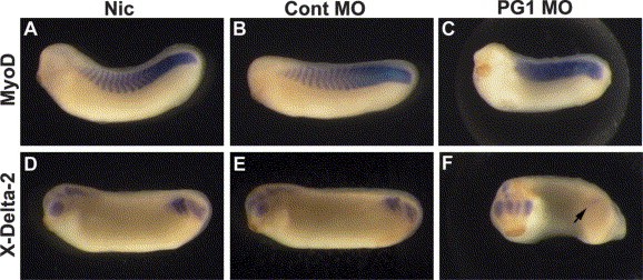 Fig. 9. Hox PG1 genes are necessary for somitogenesis and X-Delta-2 expression. Morpholinos for each of the Hox PG1 genes (Hoxa1, -b1, and -d1) were injected in combination into the LHS of the embryo (PG1 MO, C,F). Non-injected controls (Nic; A,D) and embryos injected with control MO (B: 100%, n=31; E: 100%, n=23) are also shown. The expression of the muscle precursor marker MyoD (A-C) and of X-Delta-2 (DâF) was analysed at late tailbud stage (stage 25). Embryos are shown from a lateral view, with the anterior side to the left. Loss of PG1 function perturbs somite formation (C: 76%, n=47) and downregulates X-Delta-2 expression in the somitomeric region (F: 79%, n=29). Arrow in (F) indicates X-Delta-2 expression in the somitomeric region. |
