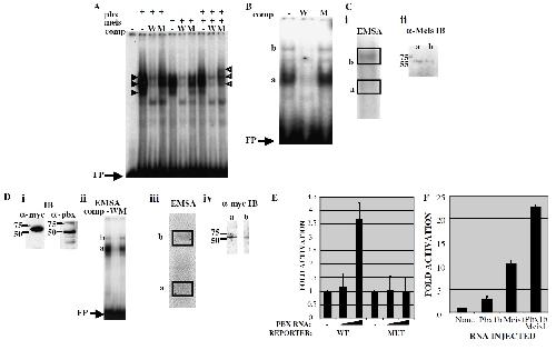 and Meis1. (B) EMSA using CR probe and tailbud embryo nuclear extract. The specific complexes observed are marked (a,b). (C) Immunoblot of proteins
