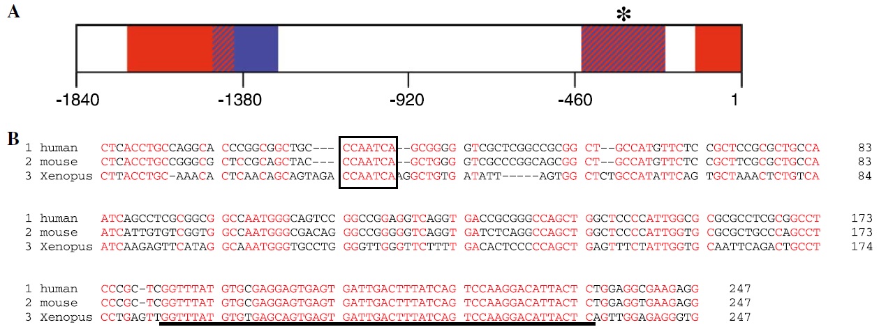 numbered from the predicted start of transcription. The 247 bp conserved region is marked (*). (B) Detail of proximal 247 bp region of high similarity
