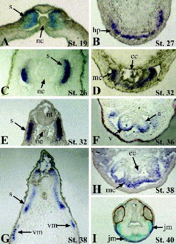 Fig. 3. Histology of Xtn3 expression. Paraffin embedded embryos were sectioned at a depth of 16 μm after in situ hybridization. (A, C, E, and G) Transverse sections through developing somites. (B, D, F, and H) Transverse sections through developing cardiac region. (I) Transverse section showing jaw myoblasts in the head. a, atrium; ec, endocardium; hp, heartprimordia; jm, jaw myoblasts; mc, myocardium; nc, notochord; nt, neural tube; s, somites; v, ventricle; vm, ventral myoblasts.