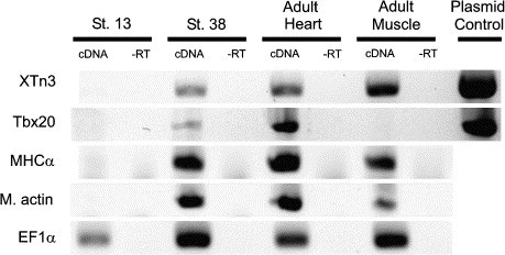 Fig. 4. Xtn3 is expressed in adult heart and skeletal muscle. RNA from St.13 embryos, St.38 embryos, adult heart, and adult muscle tissue was isolated and 100 ng of RNA subjected to RT-PCR. Xtn3 RT-PCR shows expression in St.38, adult heart and adult muscle tissues. “−RT” controls lack reverse transcriptase to show lack of genomic contamination. Tbx20 primers serve as controls for heart tissue, MHCα and muscle actin serve as controls for muscle tissue, and EF1α serves as loading control.