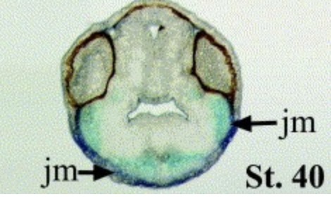 tn3 (titin novex-3) gene expression in Xenopus laevis embryos, NF stage 40, as assayed by in situ hybridization, transverse section through head at eye level, dorsal up. Key: jm= jaw muscle.