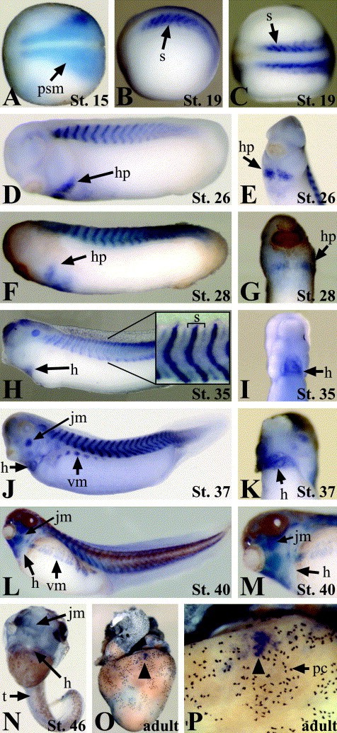 Fig. 2. Xtn3 is developmentally expressed throughout the somites, heart, and jaw myoblasts from early neurula to late tailbud stages. (AâP) In situ hybridization showing expression of the Xtn3 at the indicated stages. (AâC) Neurula stage embryos. Anterior is to the left. (A and C) Dorsal views. (B) Lateral view. (DâM) Tailbud stage embryos. (E, G, I, K, and M) Ventralanterior views. Anterior is up. (H) Inset shows higher magnification of somite region. Bracket indicates one individual somite. (N) Tadpole stage embryo. Note the lack of staining in trunk and heart. Some light staining remains in facial muscles. (O and P) Adult heart lacking global Xtn3 expression. (P) A magnification of (O). Black arrowhead indicates isolated group of Xtn3-expressing cells. h, heart; hp, heartprimordia; jm, jaw myoblasts; psm, presomitic mesoderm; pc, pigment cells; vm, ventral myoblasts; s, somites; t, trunk.