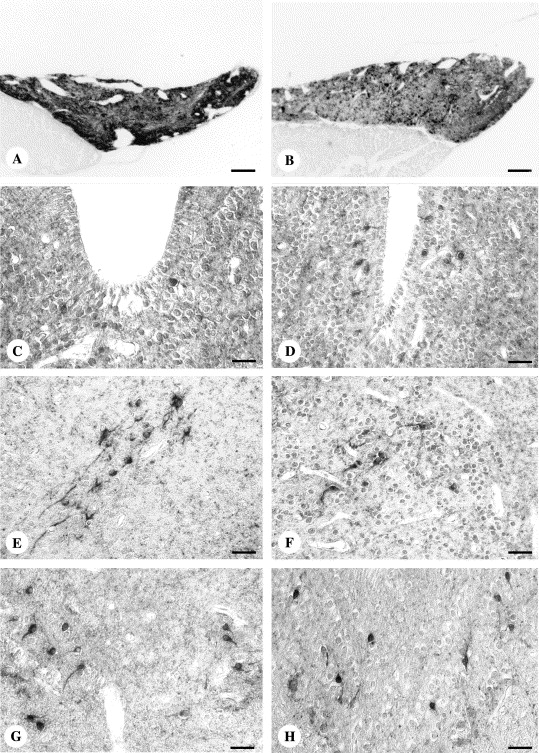 In mammals complex interactions between various brain structures and neuropeptides such as corticotropin-releasing factor (CRF) and urocortin 1 (Ucn1) underlay the control of feeding by the brain. Recently, in the amphibian Xenopus laevis, CRF- and Ucn1-immunoreactivities were shown in the hypothalamic magnocellular nucleus (Mg) and evidence was obtained for their involvement in food intake. To gain a better understanding of the brain structures controlling feeding in X. laevis, the effects of 16 weeks starvation on neurones immunoreactive (ir) to Fos and neuropeptides in various brain structures were quantified. In the Mg, compared to controls, starved animals showed fewer neurones immunopositive for Fos (-55.9%), Ucn1 (-44.0%), cocaine and amphetamine-regulated transcript (CART) (-94.3%) and metenkephalin (ENK) (-65.0%), whereas CRF-ir neurones were 2.1 times more numerous. These differences were mainly apparent in the ventral part of the Mg, followed by the medial and dorsal part of the nucleus. In the neural lobe of the pituitary gland a 22.5% lower optical density of CART-ir was observed. In the four other brain structures investigated, starvation had different effects. The dorsomedial part of the suprachiasmatic nucleus showed 5.9 times more NPY-ir cells and in the ventromedial thalamic area a lower number of NPY-ir cells (-33.6%) was found, whereas the Edinger-Westphal nucleus contained fewer CART-ir cells (-42.2%); no effect of starvation was seen in the ventral hypothalamic nucleus. Our results support the hypothesis that in X. laevis, the Mg plays a pivotal role in feeding-related processes and, moreover, that starvation also has neuropeptide- and brain structure-specific effects in other parts of the brain and in the pituitary gland, suggesting particular roles of these structures and their neuropeptides in physiological adaptation to starvation.