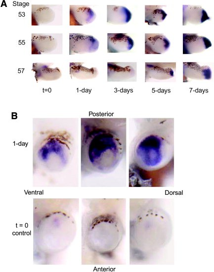 Figure 6. Expression of XlSALL4 during Xenopus hindlimb regeneration at the regeneration-competent and regeneration-incompetent stages. A: Whole-mount in situ hybridization (WISH) using anti-sense XlSALL4 probe at the stages (stage 53, 55, 57) and at the times after amputation (t = 0 control, 1-day, 3-days, 5-days, and 7-days) as indicated. Amputations were through the zeugopodia just distal to the knee joint. Dorsal views with the posterior side (pigmented) of the limb up and proximal to the left. Magnifications are variable to fit different size limbs into constant boxes. B: Expression of XlSALL4 in stage 53 amputated hindlimb stumps 1 day after amputation. End-on WISH images showing polar expression in distal amputated stump. The upper row shows three examples of the distal limb stump 1 day after amputation, while the bottom shows three controls fixed for WISH immediately after amputation (t = 0). Note intense XlSALL4 expression primarily in the posterior side of the distal limb stump 1 day after amputation compared with the t = 0 controls. By 3 days after amputation XlSALL4 expression is uniform throughout the mesenchyme of the blastema (data not shown). Anteriorâposterior and ventralâdorsal limb axes are shown. All magnifications are the same. |