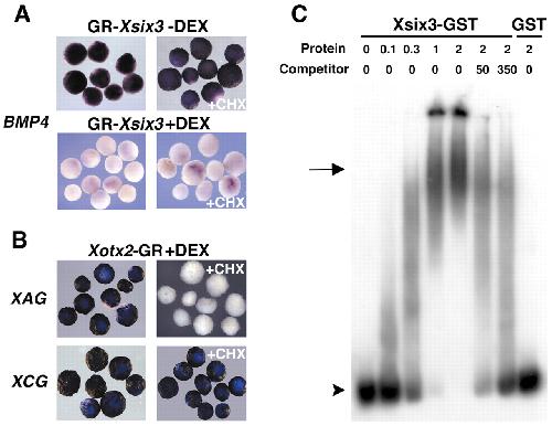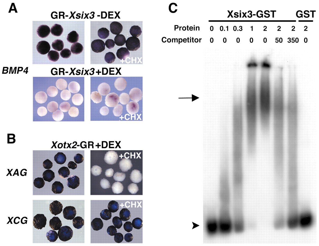 Fig. 7. Xsix3 directly represses Bmp4 transcription. (A,B) Animal caps were analysed at stage 13 for the expression of the genes indicated to the left. (A) Bmp4 repression in GR-Xsix3-injected animal caps treated either with dexamethasone (DEX) alone, or with both DEX and cycloheximide (CHX), compare with control with no DEX treatment shown above. (B) Control of CHX treatment. Xotx2-GR-injected animal caps treated with DEX alone, or with both DEX and CHX. (C) Xsix3 binds to a Bmp4 promoter fragment containing homeodomain-binding sites. Xsix3-GST, but not GST alone, binds to the labelled Bmp4 promoter to form various complexes in a concentration-dependent manner. Addition of an excess of unlabelled Bmp4 promoter fragment (50- to 350-fold) significantly inhibits the binding. The arrow indicates the major complex formed with the highest protein concentration. The arrowhead indicates the free probe. The amount of added protein is indicated in micrograms. |