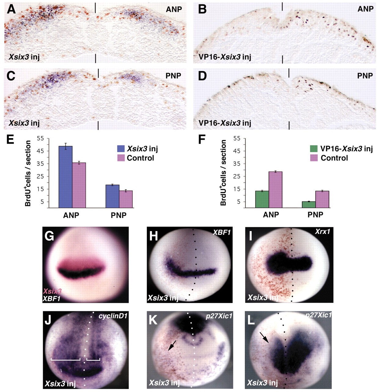 Fig. 1. Xsix3 promotes cell proliferation in the neural plate. (A-D) Transverse sections of stage 13 embryos injected with either Xsix3 (A,C) or VP16-Xsix3 (B,D), processed simultaneously for BrdU incorporation (brown nuclear staining), and Zic2 (A,C, blue staining) or lacZ (B,D, red staining) expression. Sections are at the level of the anterior (A,B) or posterior neural plate (C,D). ANP, anterior neural plate; PNP, posterior neural plate. (E,F) The average number of BrdU-positive cells per section in either the control side (magenta) or the side injected with Xsix3 (blue) or VP16-Xsix3 (green). Error bars indicate s.e.m. (G) Double whole-mount in situ hybridization of a stage 13 embryo shows that the Xsix3 (magenta) and Xbf1 (purple) expression domains overlap. (H-J) Stage 13 (H,I) and stage 14 (J) embryos injected with Xsix3 display expansion of the Xbf1 (H), Xrx1 (I) and cyclinD1 (J) expression domains. White brackets indicate the anterior expression domain of cyclinD1 in the control (right) and injected (left) side. (K,L) Xsix3 overexpression represses p27Xic1 both in the anterior, trigeminal ganglion (K, arrow) and in its posterior expression domain (L, arrow) in stage 13 embryos. (G-K) Frontal views, dorsal towards the top; (L) dorsal view, anterior towards the bottom. Red staining represents expression of a co-injected lacZ lineage tracer. The injected side of the embryos (to the left of vertical bars or dotted lines representing the midline) is indicated (inj). |