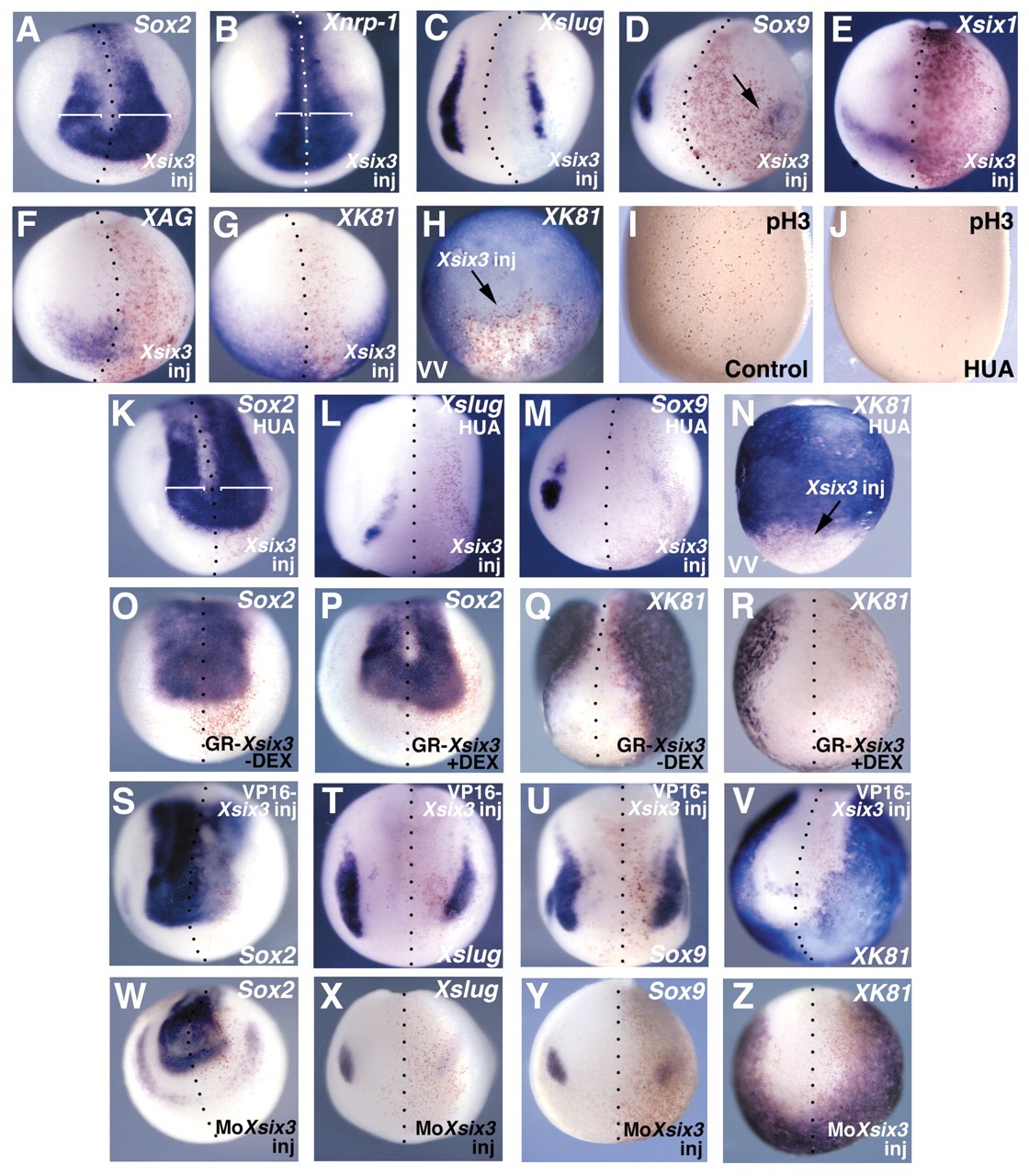 Fig. 2. Alterations of the size of the neural plate in Xsix3 gain- and loss-of-function experiments. (A-H,K-Z) Embryos injected unilaterally with Xsix3 (A-H,K-N), GR-Xsix3 (O-R), VP16-Xsix3 (S-V) or MoXsix3 (W-Z), and analysed at early neurula stage. The probes used are indicated in each panel. Red staining in A,B,D-H,K-Z and turquoise staining in C represent expression of the co-injected lacZ lineage tracer. The injected side of the embryos (to the right of dotted lines representing the midline) is indicated (inj). (A-G,K-M,O-Z) Frontal views, dorsal towards the top; (H,N) ventral views (VV), anterior towards the bottom. (H,N) Arrows indicate Xk81 repression caused by Xsix3 overexpression. (I,J) Embryos untreated (I) or treated (J) with HUA, brown nuclear staining representing anti-phosphorylated histone H3 staining; dorsal views, anterior towards the bottom. (K-N) Embryos injected with Xsix3 and treated with HUA. (A,B,K) White brackets indicate the anterior expression of Sox2 (A,K) or Xnrp1 (B) in Xsix3-injected (right) and control (left) sides. |