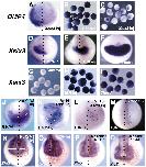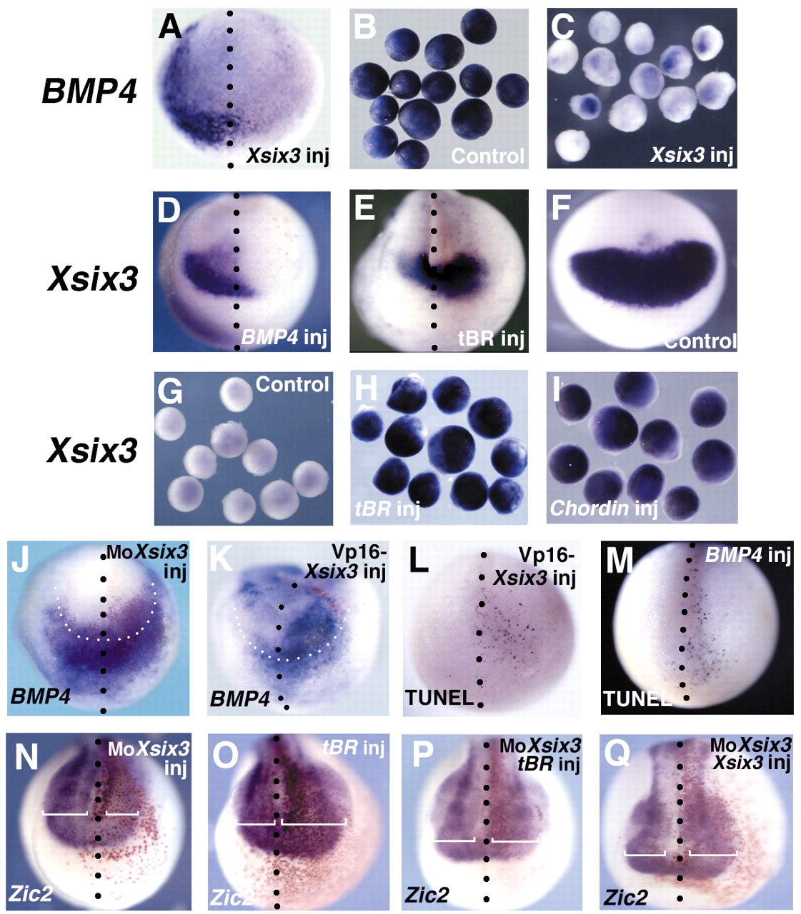 Fig. 5. Xsix3 and Bmp4 repress each other. (A-Q) Control and injected embryos, and animal caps, were analysed at stage 13 for the expression of the genes indicated. (A-C) Xsix3 overexpression represses Bmp4 expression in embryos (A) and animal caps (C), whereas uninjected caps (B) strongly express Bmp4. (D) Xsix3 is repressed in embryos injected with Bmp4. (E) tBR injection expands the Xsix3 expression domain. (G-I) Animal caps injected with tBR (H) or Chordin (I) strongly express Xsix3, whereas uninjected caps (G) do not express Xsix3. (J,K) MoXsix3- and VP16-Xsix3-injected embryos display anterior expansion of Bmp4 (the white dots indicate the anterior neural plate border). (L,M) VP16-Xsix3 and Bmp4 injection induces apoptosis (TUNEL staining) in the anterior neural plate. (N,O) MoXsix3 reduces (N) and tBR expands (O) the domain of Zic2 expression. (P,Q) Zic2 repression is rescued in embryos co-injected either with MoXsix3 and tBR (P, compare with N), or with MoXix3 and Xsix3 (Q, compare with N). |