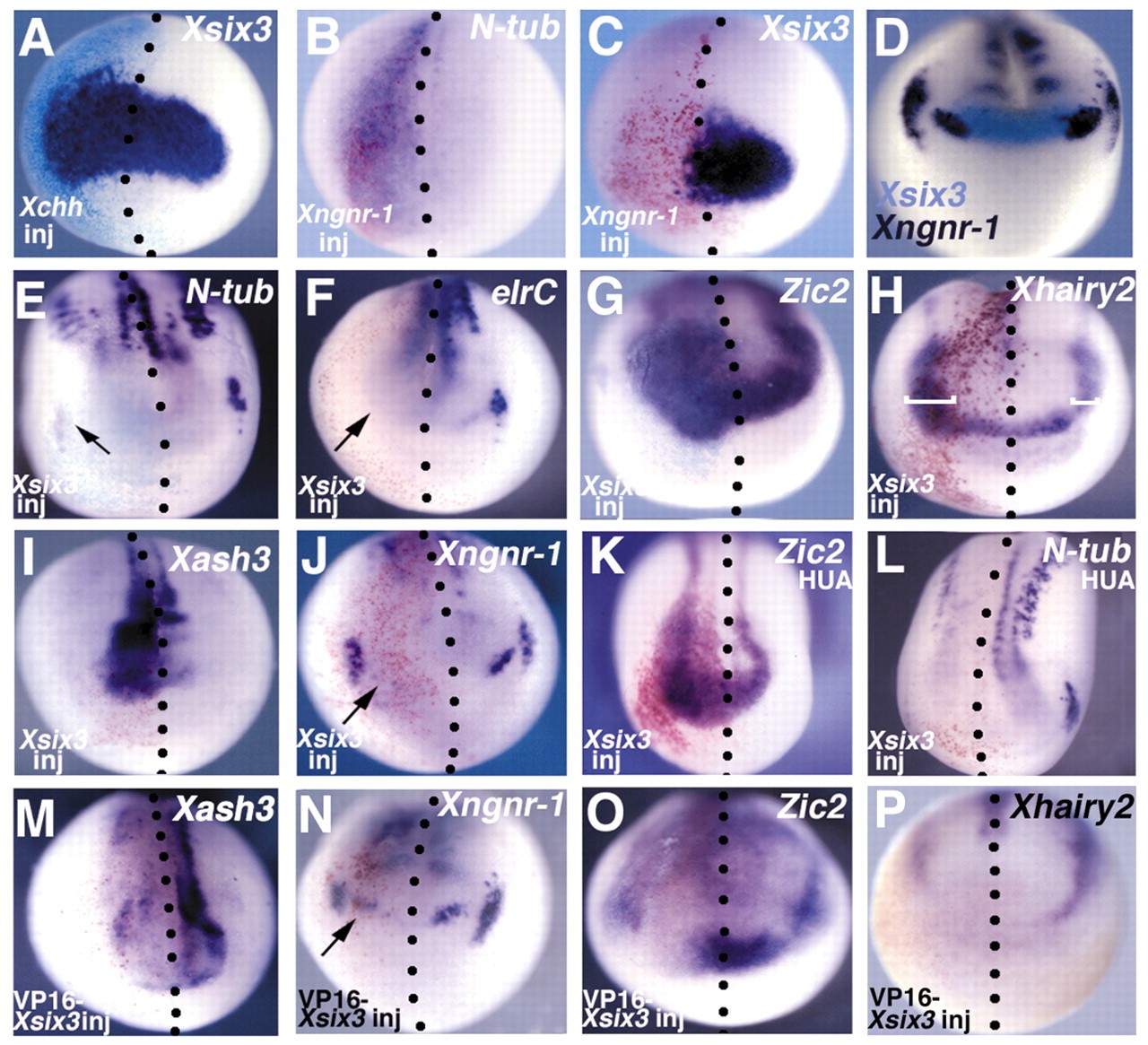 Fig. 3. Xsix3 regulates the expression of genes that control cell differentiation, and its expression is controlled by Hedgehog and Neurogenin signalling. (A-C) Embryos injected unilaterally with Xchh (A) and Xngnr1 (B,C) display ectopic expression of Xsix3 (A) and N-tubulin (B), and repression of Xsix3 (C). (D) Comparison of the expression of Xsix3 (light blue) with that of Xngnr1 (purple) in a stage 13 embryo. (E-K) Embryos injected with Xsix3 display repression of N-tubulin (E, the arrow indicates the repressed expression in the trigeminal ganglion), elrC (F) and Xngnr1 (J), and ectopic expression of Zic2 (G), Hairy2 (H) and Xash3 (I). (K,L) Embryos injected with Xsix3 and treated with HUA show expansion of Zic2 (K) and repression of N-tubulin (L). (M,O,P) Embryos injected with VP16-Xsix3 display reduction of the Xash3 (M), Zic2 (O) and Xhairy2 (P) expression domains. (J,N) Arrows indicate the anterior boundaries of Xngnr1 in the injected side of the embryo. (A-P) Frontal views, dorsal towards the top. Red staining in B,C,F-P and turquoise staining in A,E represent expression of the co-injected lacZ lineage tracer. The injected side of the embryos (to the left of dotted lines representing the midline) is indicated (inj). (H) White brackets indicate the anterior expression of Xhairy2 in Xsix3-injected (left) and control (right) sides. |