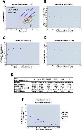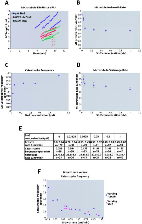 Figure 5. Stu2p induces catastrophes by decreasing microtubule growth rate. Real-time VE-DIC analysis of microtubules in the presence of increasing amounts of Stu2p. (A) Three examples of traces of individual microtubules at 0, 62.5, and 500 nM Stu2p. (B) Stu2p inhibits microtubule growth rate. A plot showing the averaged growth rates of microtubules at different concentrations of Stu2p. Error bars represent the SEM (P ≤ 0.05). (C) Stu2p increases microtubule catastrophe frequency. A plot showing the microtubule catastrophe frequency at different concentrations of Stu2p. (D) Stu2p decreases microtubule shrinkage rate. A plot showing the averaged shrinkage rates of microtubules at different concentrations of Stu2p. Error bars represent the SEM (P ≤ 0.05). (E) The derived dynamic parameters of microtubule polymerization in the presence of increasing amounts of Stu2p. The rescue frequency could not be determined. (F) Stu2p does not directly stimulate microtubule catastrophes. A plot showing the microtubule growth rate catastrophe frequency relation in pure tubulin (varying tubulin). The growth rates and corresponding catastrophe frequencies with varying amounts of Stu2p (as summarized in E) were added to this plot. Growth rate and corresponding catastrophe frequency at increasing concentrations of pure tubulin were obtained by VE-DIC, individual microtubule traces were binned in 0.06 μm/min growth rate intervals, and the catastrophe frequency in each interval was calculated subsequently.