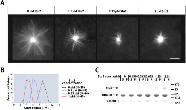 Figure 3. Stu2p decreases microtubule length in vitro. (A) Microtubule asters at increasing Stu2p concentrations visualized by incorporation of rhodamine tubulin. Shown are representative examples of asters at 0, 0.1, 0.33, and 1 μM Stu2p. Bar, 4 μm. (B) Plot showing the distribution of aster radii at each Stu2p concentration. (C) Stu2p does not cause spontaneous tubulin nucleation in solution. Increasing amounts of Stu2p were incubated with 22 μM tubulin for 10 min at 29°C. Reactions were spun through a 40% glycerol cushion, and equivalent amounts of supernatants (S) and pellets (P) were analyzed by SDS-PAGE and Coomassie blue staining.