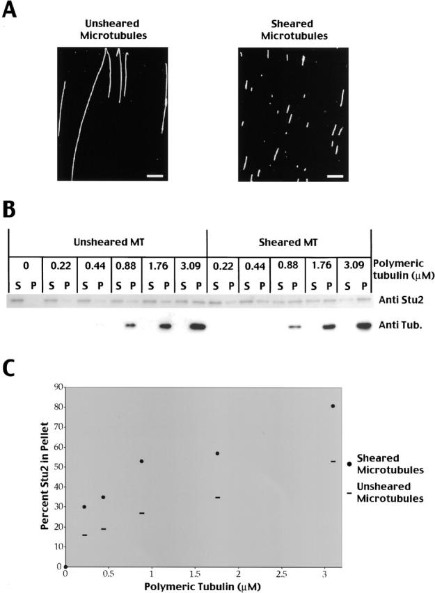 Figure 6. Stu2p binds preferentially to microtubule ends. (A) Antitubulin immunofluorescence of taxol stabilized microtubules before and after shearing with a tip sonicator. Bar, 5 μm. (B) Stu2p binds to a higher extent to sheared microtubules. Increasing amounts of unsheared or sheared microtubules were incubated with 19 nM Stu2p, and bound Stu2p separated from unbound Stu2p by centrifugation. Equivalent amounts of supernatants (S) and pellets (P) were analyzed by SDS-PAGE and Western blotting using a polyclonal Stu2p antibody (top) or a monoclonal tubulin antibody (bottom). (C) Plot showing the percentage of Stu2p bound to microtubules at different microtubule concentrations.