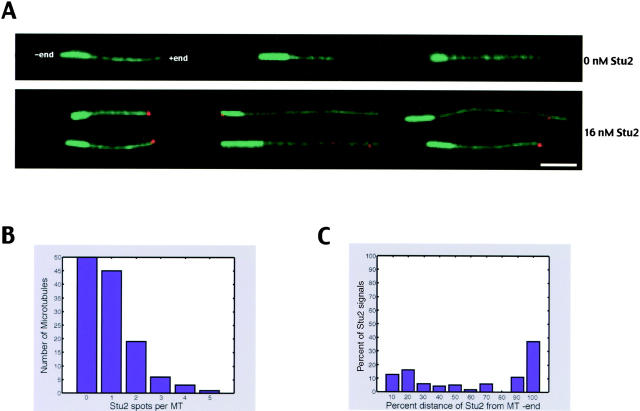 Figure 7. Stu2p binds preferentially to microtubule plus ends. Visualization of Stu2p binding to microtubules using directly Cy3-labeled Stu2p and polarity-marked microtubules. Stu2p intensity was scanned in the rhodamine channel from the minus end along the length of microtubules, and signals higher than 10% of the median intensity were scored with their location. (A) Representative examples of polarity-marked microtubules in the absence or in the presence of 16 nM Stu2p. Polarity marked microtubules are in green, and Stu2p is in red. The minus end of microtubules is brighter than the plus end. Bar, 3 μm. (B) Histogram showing the number of Stu2p spots per microtubule. (C) Histogram showing the percentage of Stu2p signals found in 10% intervals from the minus ends of the microtubules to their plus ends.