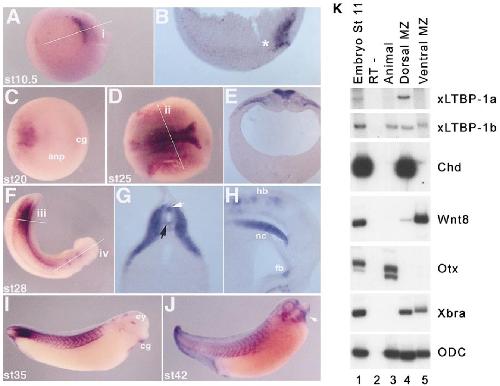 FIG. 3. In situ hybridization of Xenopus LTBP-1. (AâJ) In situ hybridization. (A): Stage 10.5 (gastrula). Expression of xLTBP-1 is detected