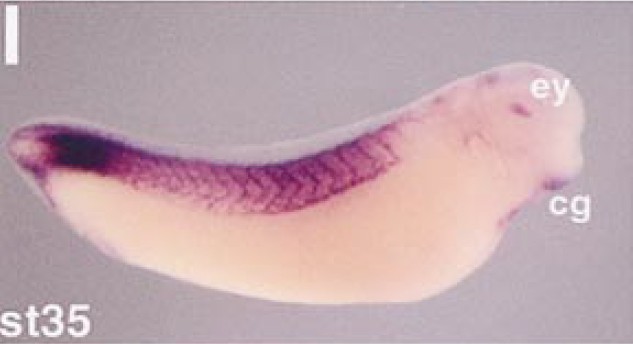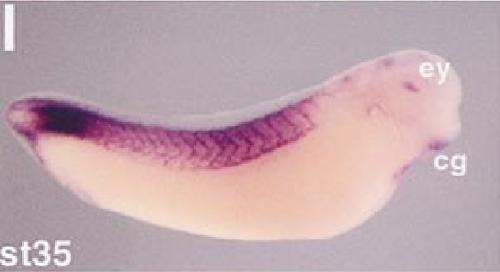 surrounding the spinal cord. It is also expressed in the rhombomeres of the hindbrain, the eye, and the cement gland. High expression is