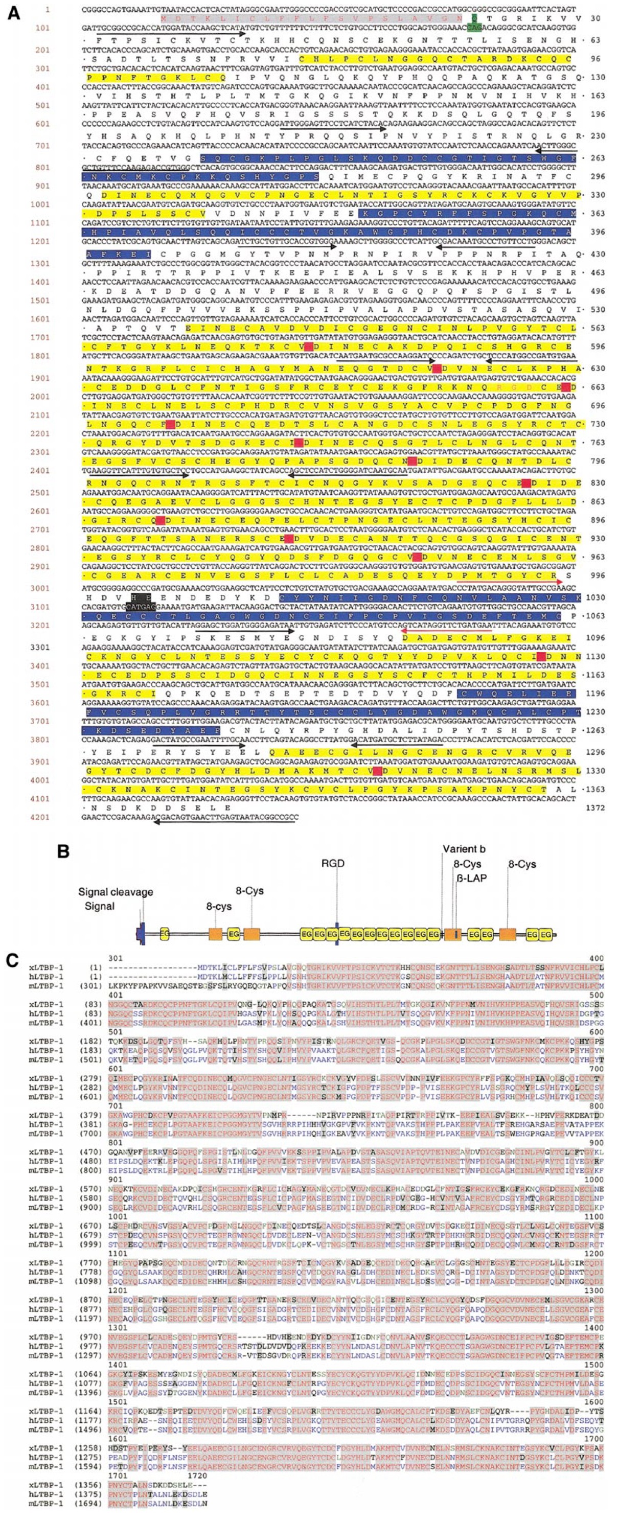 25-amino-acid deletion GTNSFGESNNDSLLNTFSPSVTHDNT. (B) Diagram of Xenopus LTBP-1 indicating the domain structure. (C)