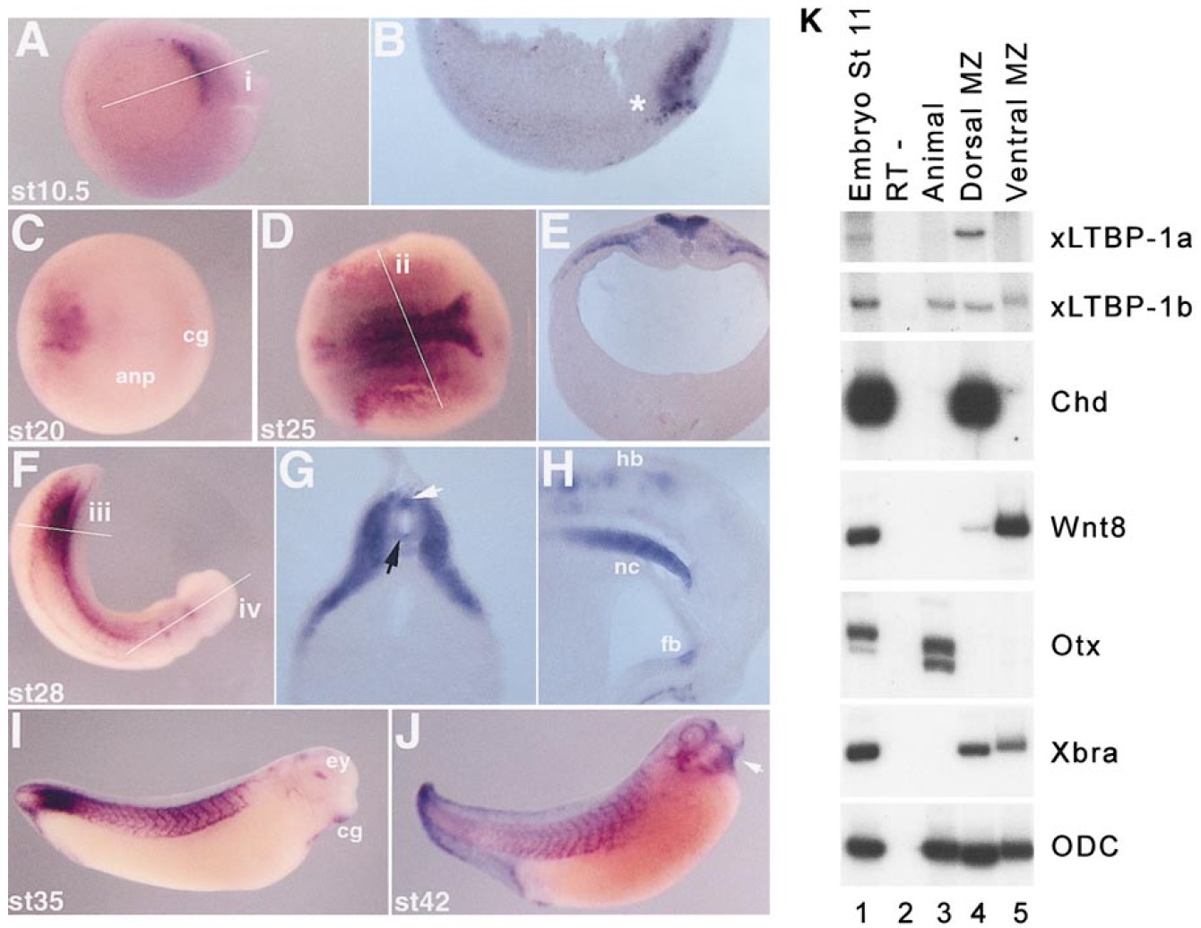 (H) Midsagital section through the head (line âivâ in F). xLTBP-1 RNA is also expressed in anterior regions, in the hindbrain, and in the