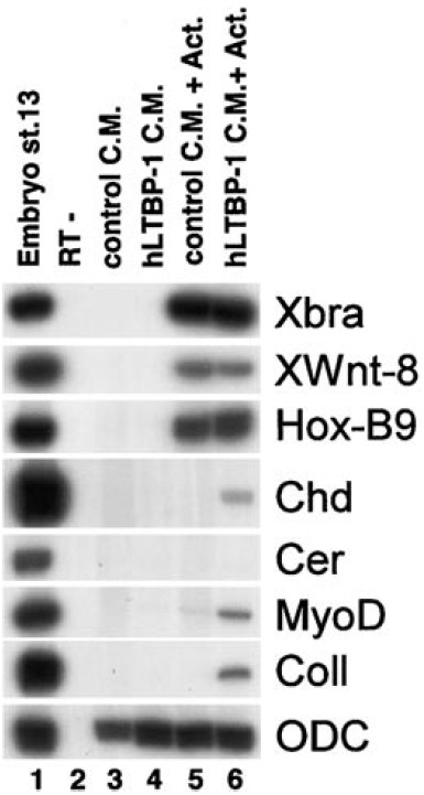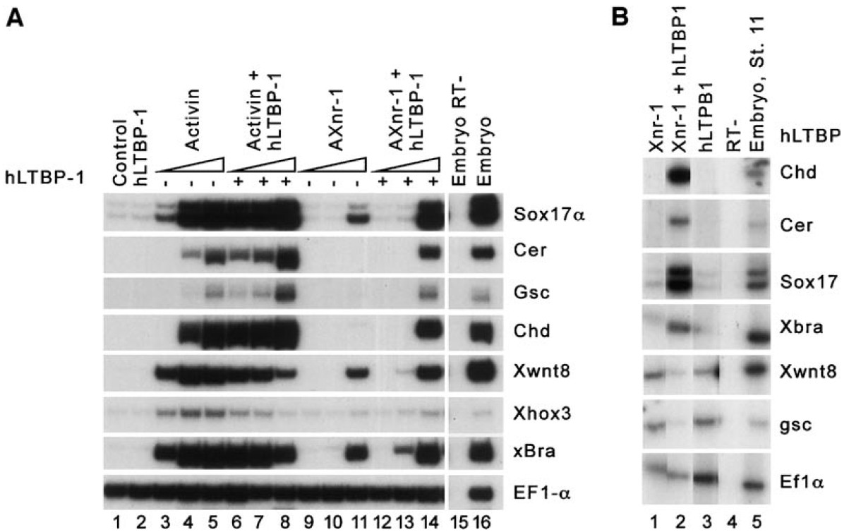 cultured until sibling controls reached stage 11 and processed for RT-PCR as described. (B) Coexpression of hLTBP-1 with Xenopus nodal