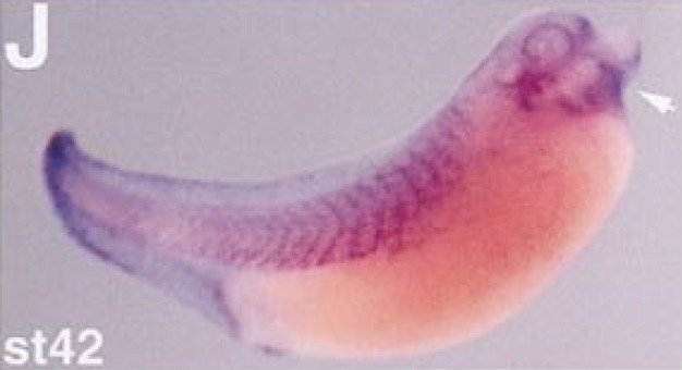 present in the tailbud cordoneural hinge. (J) Stage 42. Additional xLTBP-1 RNA expression is observed in more anterior regions, including