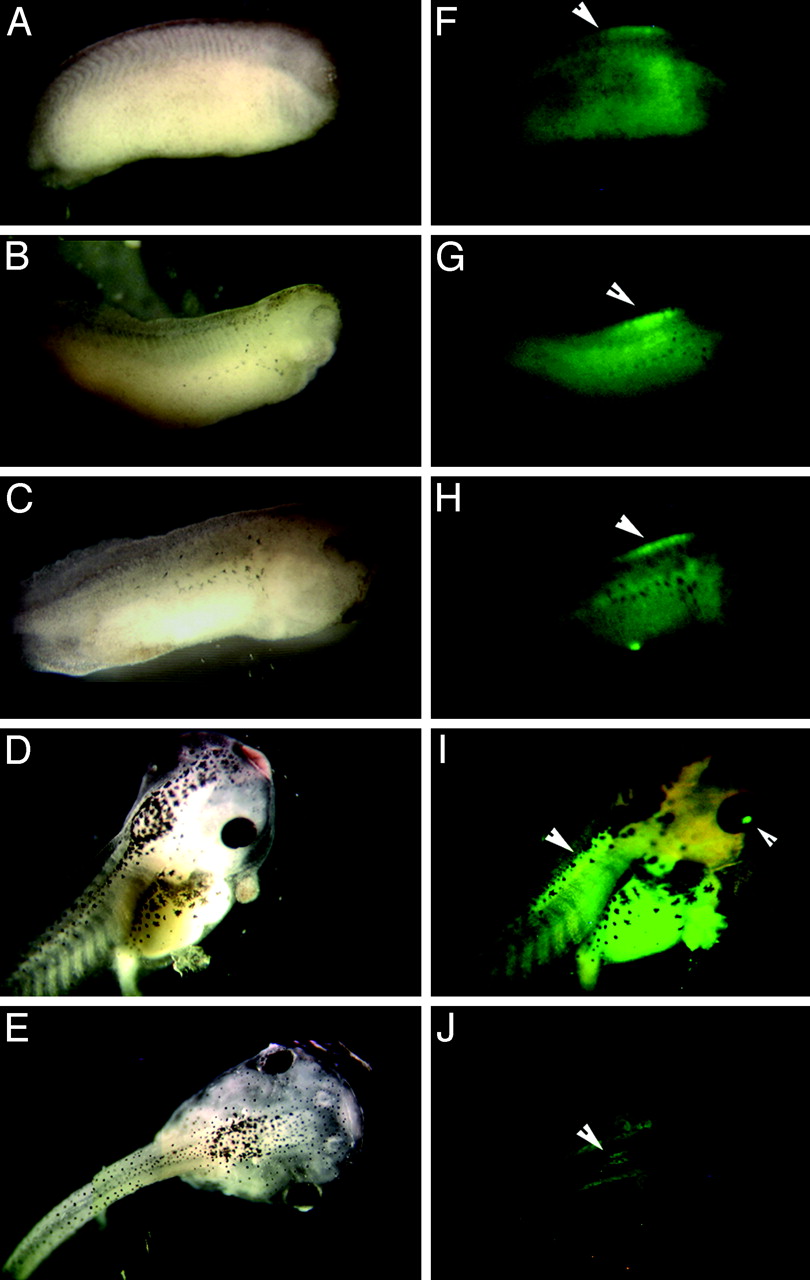 Fig. 4. Developmental activation of the gRXR fusion protein in the X. laevis spinal cord. EGFP expression is specifically induced in the rostral spinal cord of NβTgRXR/UAS-E1b-EGFP transgenic embryos beginning at stage 24 (A and F), and continuing through stages 26 (B and G), 35 (C and H), and 42 (D and I, overlaid image), but disappears by stage 46 (E and J). Bright field images are shown in AâE; fluorescent images are shown in FâJ. Arrows indicate location of fluorescence induced above background autofluorescence, including both spinal cord and eye (in I).