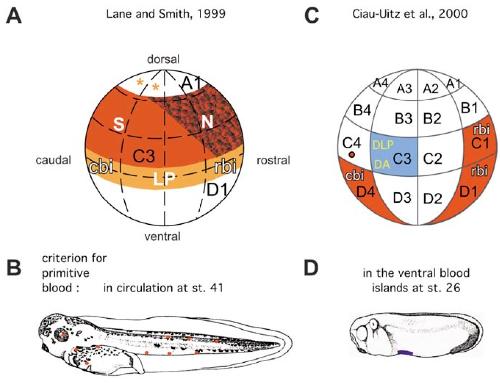 FIG. 1. Conflicting reports on the origins of primitive blood in Xenopus. (A) Lane and Smith (1999) labeled each of the 16 different