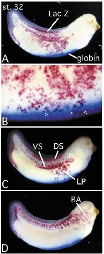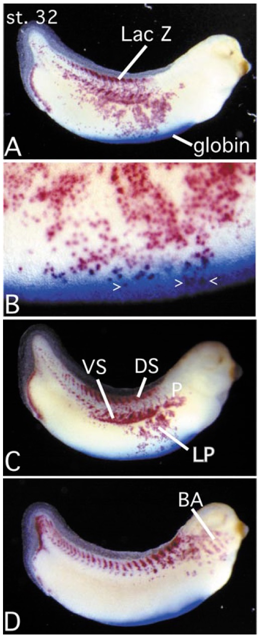 presence of progeny at st. 26 in the region of the VBI (D), in some cases by overlap with marker genes such as globin. The expression pattern