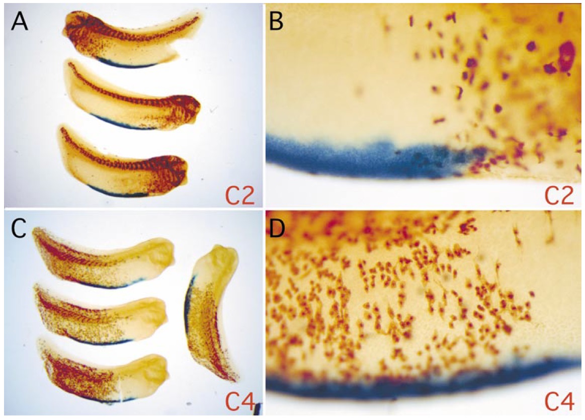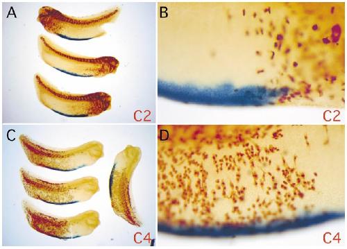 FIG. 7. Blastomeres C2 and C4 contribute progeny to the VBI. (A, B) Mini-ruby dextran and Lac Z mRNA were coinjected into blastomere