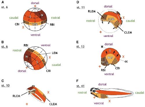 head, heart, liver and RBI; S, somite; , indicates the animal pole, which in anurans forms epidermis covering the heart; X, marks the site