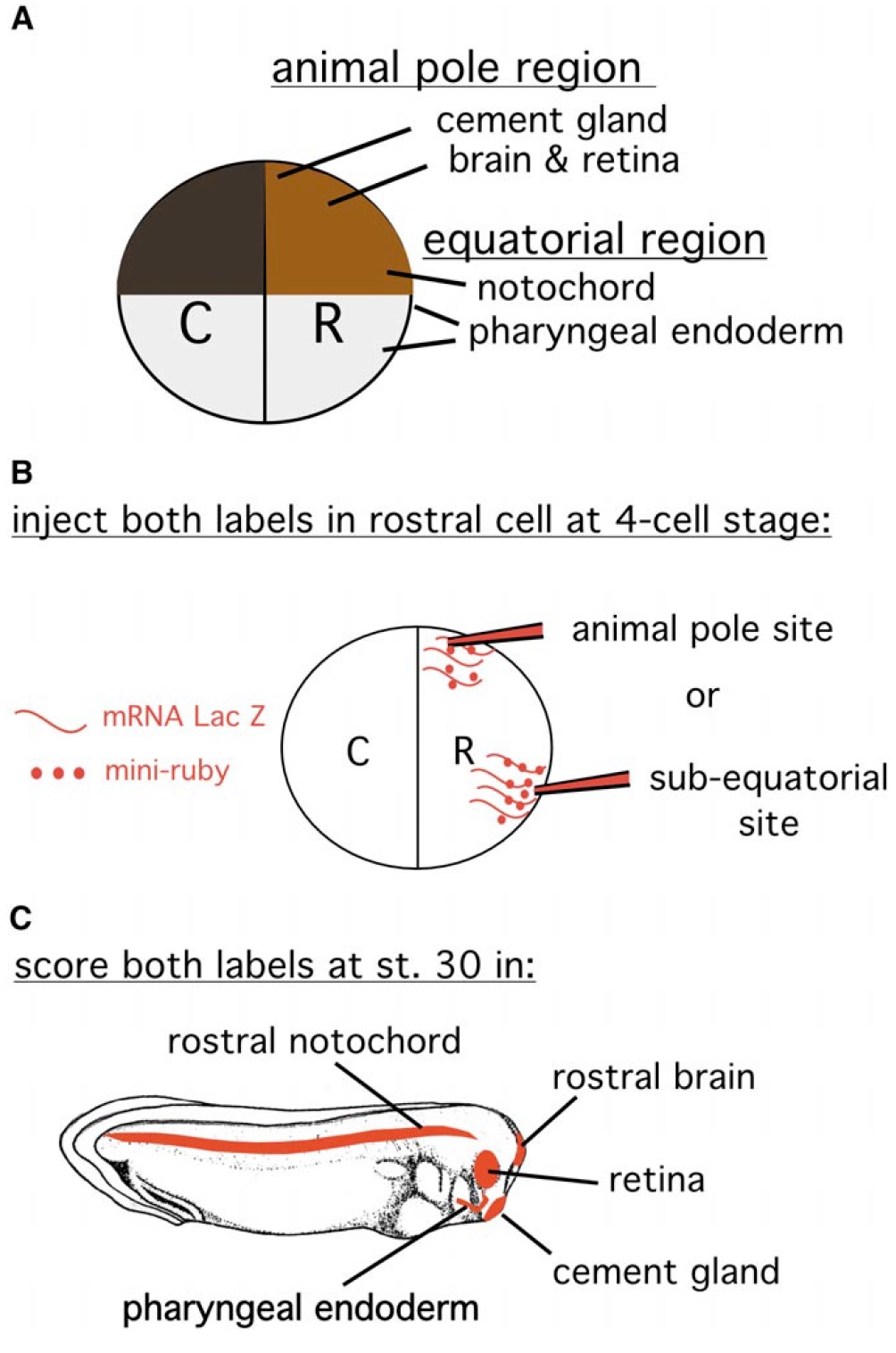 rise to rostral notochord and pharyngeal endoderm. (B). In the coinjection assay, a mixture of mini-ruby dextran and Lac Z mRNA was