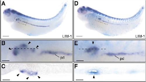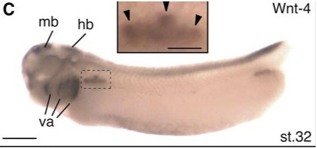 FIG. 1. Wnt-4 is expressed in the pronephric anlage and pronephric tubules. Wnt-4 transcripts were detected by whole-mount in situ hybridization. (A, F) Lateral views of Xenopus embryos with anterior to the left. (A) Wnt-4 expression in the pronephric anlage (arrowhead) of a stage 19 embryo. Expression is also present in the brain (b) and neural tube (nt). (B) At stage 24, Wnt-4 expression is prominently detected in the pronephric tubule anlage (arrowhead) and the ventralblood islands (bi). (C) At stage 32, Wnt-4 expression was associated with the pronephric tubules. Inset shows an enlargement of the pronephros with the three nephrostomes (arrowheads). Other regions with Wnt-4 expression include visceral arches (va), the neural tube, and discrete sections of the mid- and hindbrain (mb, hb). (D, E) Sections of stage 24 (D) and 32 (E) embryos hybridized in whole mount with Wnt-4 antisense probes. Embryos were embedded in agarose and transverse sections (30 ï°m) were cut at the level of the developing pronephric kidney. Sections are oriented with dorsal to the top. (D) Wnt-4 expression was detected in the pronephric anlage (pa) and neural tube (nt). The inset shows an enlargement of Wnt-4 expression in the somatic layer (so) of the intermediate mesoderm. The splanchnic layer (sp) and endoderm (ed) are devoid of any expression. (E) Wnt-4 expression is associated with the developing pronephric tubules (pt) and the floor plate (fp). The inset shows a close-up view of Wnt-4 expression in the pronephric tubules. (F) A stage 32 embryo stained for Pax-2 expression to visualize the pronephric kidney with tubules (arrowheads) and duct (pd) is shown for comparative purposes. Scale bars: 600 ï°m (A, B, C, F); 200 ï°m (inset in C); 140 ï°m (D, E); 40 ï°m (insets in D, E).