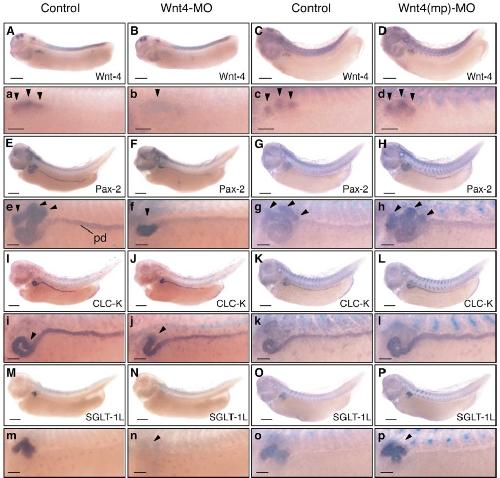 FIG. 5. Down-regulation of pronephric tubule-specific gene expression caused by injection of Wnt4-MO. Coinjections of 5 ng morpholinos [Wnt4-MO: B, F, J, N; or Wnt4(mp)-MO: D, H, L, P] and the lineage tracer cytBgal (0.1 ng) were performed into single V2 blastomeres at the eight-cell stage. Injected embryos were fixed at stages 29/30 (A) or 33/34 (E) and processed for Beta-gal activity. Expression of various marker genes was visualized by whole-mount in situ hybridization. Embryos with control and injected sides, respectively, are shown accompanied by enlargements of the pronephric region (a). (A) Injection of Wnt4-MO resulted in specific down-regulation of nephrostomal Wnt-4 expression (arrowheads), whereas injection of Wnt4(mp)-MO did not affect Wnt-4 expression. (E) Absence of discernable tubular Pax-2 expression (arrowheads) was observed in Wnt4-MO, but not in Wnt4(mp)-MO injected embryos. Expression of Pax-2 in the pronephric duct (pd) was largely unaffected by injection of either MO. (I) Pronephric expression of CLC-K is essentially normal in MO-injected embryos. Reduced coiling of the anterior duct portion (arrowhead), however, is observed with Wnt4-MO-injected embryos. (M) Injection of Wnt4-MO, but not Wnt4(mp)-MO, abolishes SGLT-1L expression (arrowhead). Scale bars: 400 um (A); 120 um (a).