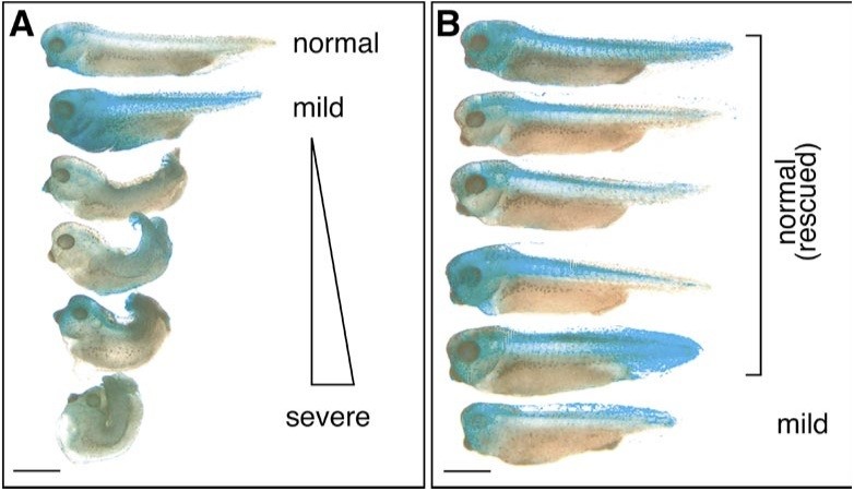 FIG. 4. In vivo suppression of the Wnt-4 overexpression phenotype by Wnt-4 antisense morpholinos. Both blastomeres at the two-cell stage were injected with either 0.25 ng Wnt-4 mRNA alone or Wnt-4 mRNA and Wnt4-MO (0.25 ng each). RNA encoding cytoplasmic -galactosidase mRNA (cytgal) was coinjected as a lineage tracer. Embryos were fixed at stage 33/34, processed for gal activity, and classified according to their phenotype. (A) Injection of Wnt-4 mRNA frequently causes a shortened body-axis phenotype. In the experiment shown, 31% (n 25) of the embryos were normal or mildly affected. Moderate phenotypes were observed in 64% (n 52) and severe truncations were found with 5% (n 4) of the embryos. Examples of embryos with phenotypes ranging from mild to severe are shown. (B) Coinjection of Wnt4-MO rescues Wnt-4-injected embryos. Out of the injected embryos (n 41), 85% developed with no discernable phenotype. Examples of rescued embryos are shown. A mild shortened body-axis phenotype was observed with 15% of the embryos. Scale bars: 1.1 mm (A); 1 mm (B)