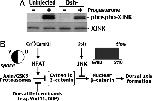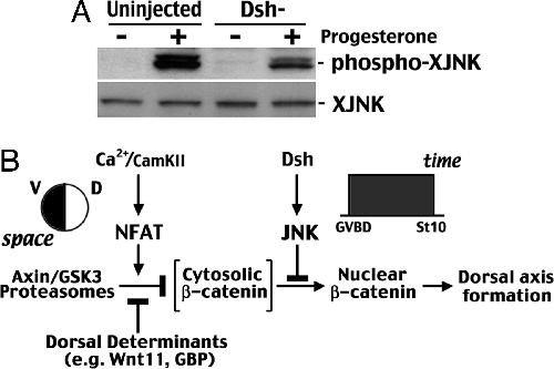 Fig. 5. Maternal JNK is activated through Dsh and provides temporal regulation of canonical Wnt/β-catenin signaling for axis formation in Xenopus. (A) Oocytes injected with antisense oligos against Dsh (Dshâ) still undergo germinal vesicle breakdown, but have a reduced level of JNK phosphorylation and activity as shown in this representative blot from three independent experiments. XJNK, Xenopus JNK. (B) Summary of the results from the present study and the literature to illustrate how Dsh/JNK and Ca2+/CamKII/NFAT provide temporal and spatial restriction of the canonical Wnt/β-catenin pathway, respectively, for axis formation in early Xenopus development. CamKII, camodulin kinase II; GVBD, germinal vesicle breakdown. |