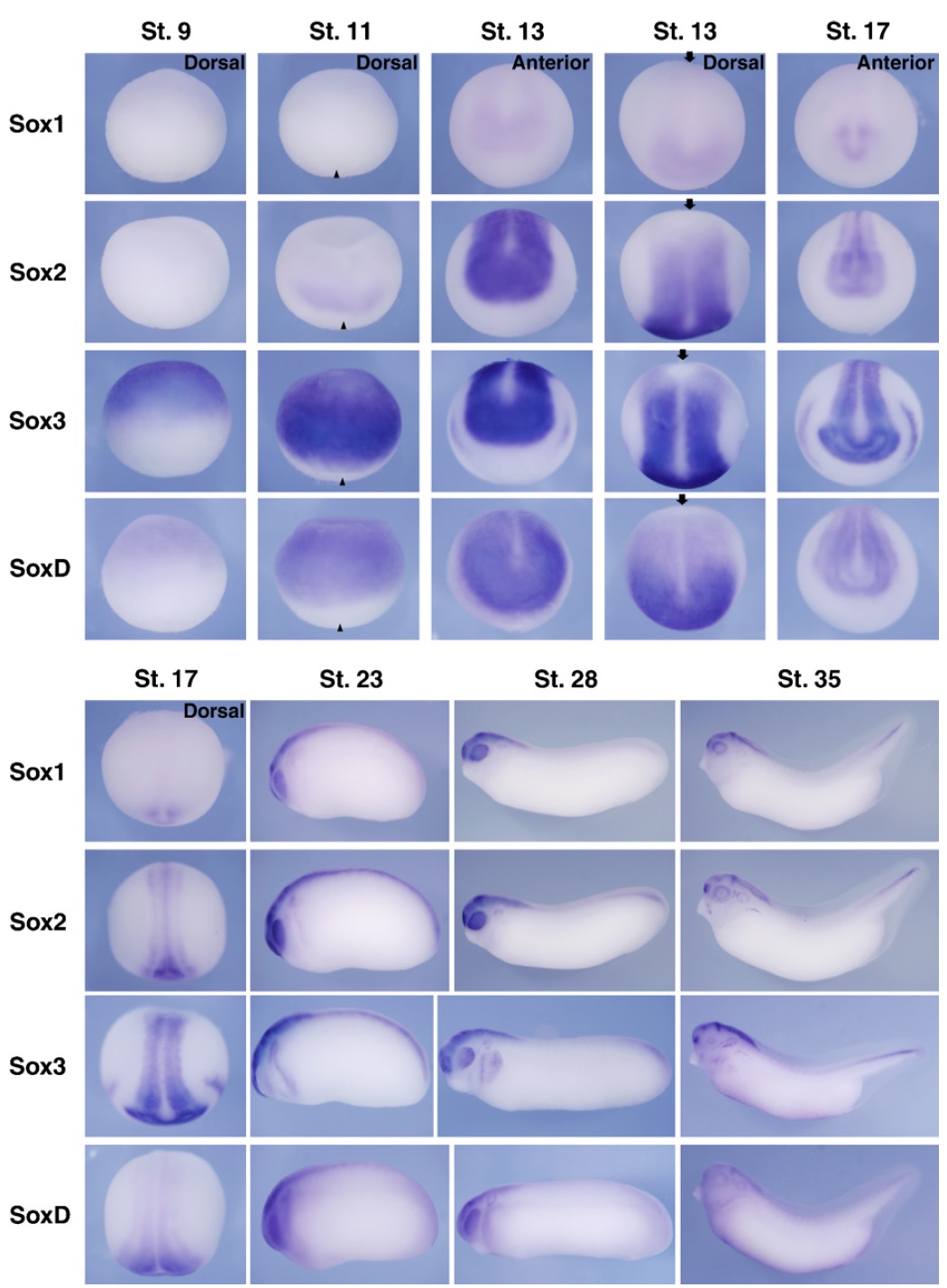 stages. Sox1 and Sox2 transcripts appeared at stage 11 and were detected