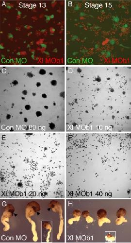 Fig. 2. Down-regulation of NRH1 proteins causes defects in gastrulation. (A) X. laevis embryos were injected at the one-cell stage with 80 ng of a control MO, or Xl MOa1 or Xl MOb1. Embryos shown are at the equivalent of neurula stage 16. Note that embryos injected with control MO develop normally, while those injected with Xl MOa1 (B) or Xl MOb1 (C) do not complete gastrulation normally. (D) Embryos injected with 40 or 80 ng Xl MOb1 as indicated, shown at the equivalent of stage 28. Embryos injected with Xl MOb1 tend to disaggregate and arrest development so as to resemble those at gastrula or neurula stages (E, F). (G) X. tropicalis embryos injected with Xt MO show a similar phenotype to that observed in X. laevis embryos. (G, H) Embryos injected with 30 ng of a control antisense morpholino oligonucleotide develop normally, while those injected with 30 ng Xt MO do not complete gastrulation normally (I) and go on to exhibit anterior and posterior truncations (J). |
