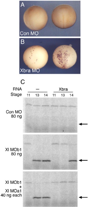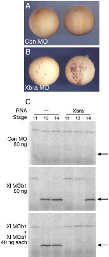 Fig. 8. Apoptosis in embryos injected with NRH1 antisense morpholino oligonucleotides is delayed or prevented by injection of RNA encoding Xbra. (A, B) Inhibition of Xbra function by injection of a specific MO causes limited apoptosis. (A) TUNEL staining of embryos injected at the one-cell stage with 80 ng control MO and cultured to stage 14. Note the absence of apoptosis. (B) TUNEL staining of embryos injected with 80 ng Xbra MO. Note apoptotic cells. (C) Injection of RNA encoding Xbra delays or rescues apoptosis induced by NRH1 MOs. Embryos were injected at the one-cell stage with 80 ng of a control MO or with Xl MOb1 or Xl MOa1 as indicated. They then received, at the 2- cell stage, a total of 50 pg Xbra RNA injected at four positions in the equatorial region. Embryos were cultured for equivalent times to the indicated stages, and extracts were assayed for the ability to cleave tPARP. Note that the onset of caspase activity is delayed or prevented by Xbra. This experiment has been carried out twice, with the same result both times. |