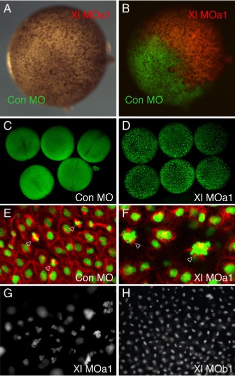 Fig. 3. Antisense morpholino oligonucleotide Xl MOa1 causes defects in nuclear division. (A, B) One cell of an X. laevis embryo at the two-cell stage was injected with 40 ng control MO together with fluorescein-dextran (green), and the other cell was injected with Xl MOa1 together with rhodamine-dextran (red). Note that Xl MOa1 causes retardation of cell division. (C, D) By neurula stage 14, embryos injected with Xl MOa1 have many fewer cells than control embryos and larger nuclei. DNA is stained with SYTOX green. (C) Embryo previously injected at the one-cell stage with 80 ng control MO. (D) Embryo injected with 80 ng Xl MOa1; note the smaller number of much larger nuclei. (E, F) Higher magnification of cells in the animal pole regions of such embryos at mid gastrula stage 11. DNA is stained by SYTOX green and tubulin by means of an antibody against β-tubulin (red). (E) Embryo injected with 80 ng control MO. Note normal metaphase figures (arrowheads). (F) Embryo injected with Xl MOa1. Note mitoses with multiple spindles (arrowheads). (G, H) In a separate experiment, embryos injected with 80 ng Xl MOa1 also show abnormal mitosis (G), but cells in an embryo injected with the same amount of Xl MOb1 appear normal. |